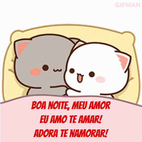 Um GIF super fofo de dois gatinhos deitados juntinhos desejando uma linda boa noite. Perfeito para mandar para aquela pessoa especial antes de dormir. Uma forma carinhosa de dizer “Boa noite, meu amor! Eu amo te amar e adoro te namorar!” e terminar o dia espalhando carinho.